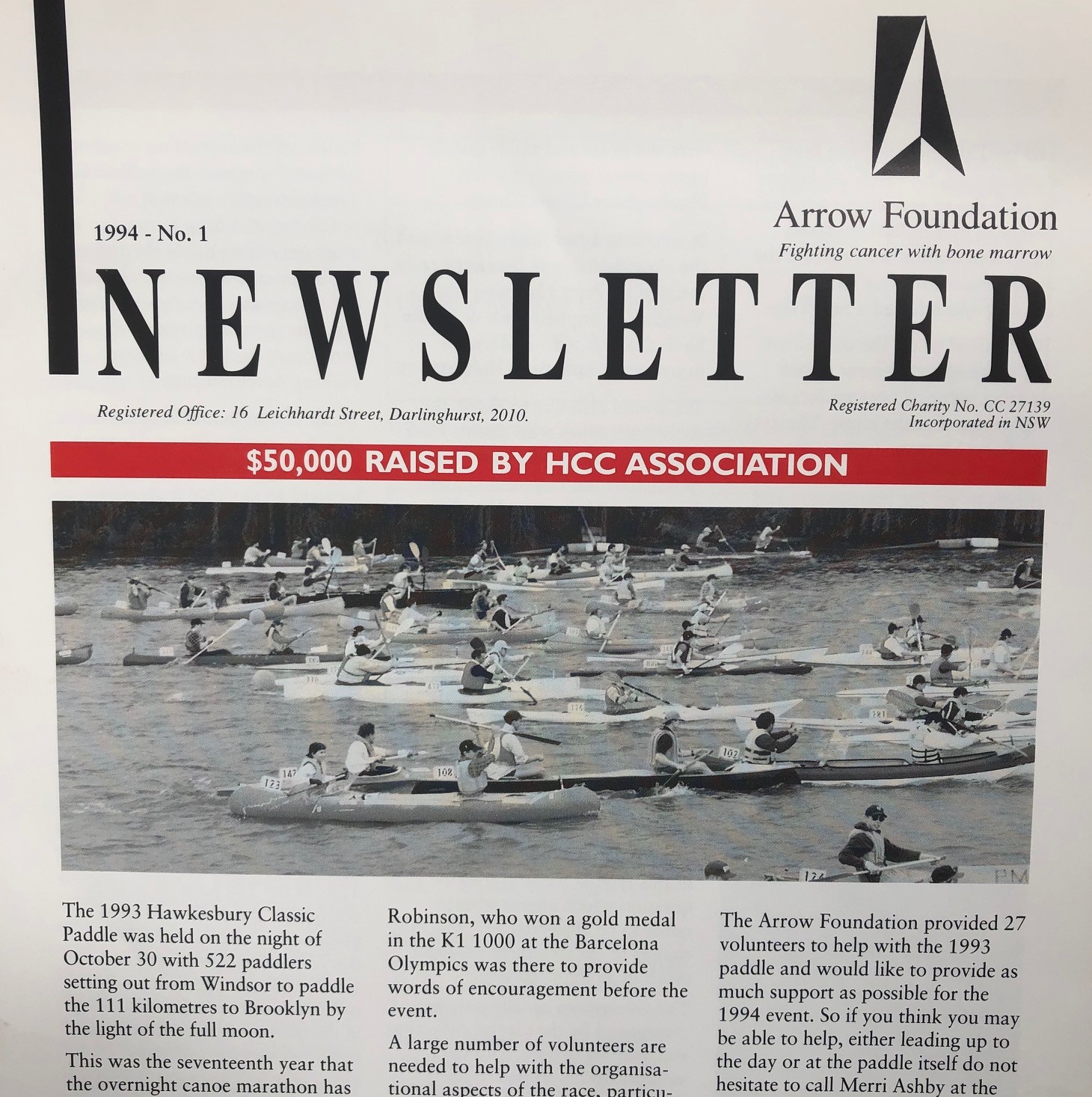 The HCC first paddled for Arrow (then named The Australian Bone Marrow Transplant Foundation) in 1993, to raise funds for a charity ‘where the funds would be used for medical research,’ according to an announcement published in the HCC’s 1993 brochure for paddlers.